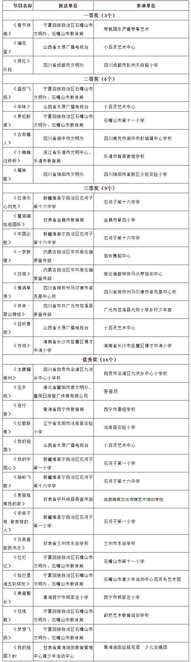 山西省太原广播电视台、内蒙古自治区通辽市文明办、浙江省乐清市文明中心、浙江省乐清市教育局、湖北省襄阳市委文明办、湖北省襄阳日报智广传媒有限公司、四川省成都市文明办、四川省绵阳市文明办、四川省自贡市文明办、四川省攀枝花市文明办、四川省广元市文明办、四川省南充市文明办、四川省阿坝州文明办、甘肃省金昌市文明办、甘肃省金昌市教育局、甘肃省中共成县委宣传部、青海省西宁市文明办、青海省西宁市教育局、宁夏回族自治区石嘴山市文明办、宁夏回族自治区石嘴山市教育体育局、新疆维吾尔自治区石河子市文明办。
