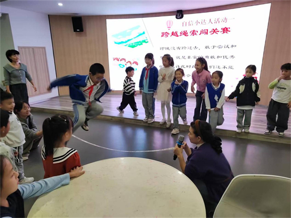 进入“自信小达人”的环节,赵老师开展了跨越绳索闯关赛活动,并鼓励孩子们只要敢于尝试和努力,即使没有跨过去也是非常勇敢和优秀的。此举既培养勇于尝试的心,又引导孩子们的情绪走向自信乐观。