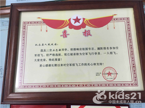 未成年人网四川讯(周增剑)7月18日,从中国人民解放军空军招收飞行学员工作局传来喜迅,叙永一中学生石忠源积极响应祖国号召,踊跃报名参加中国空军招飞,经过多次全面体检和严格体能测试选拔,最终以高考581分超重本线49分的优异成绩被录取为中国人民解放军空军飞行学员。据悉,这是叙永学生时隔10年再次考入中国空军。
