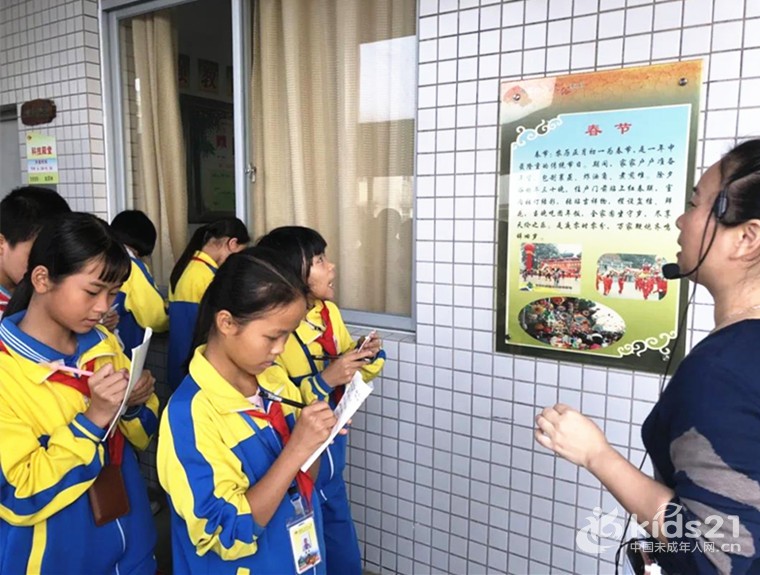 教师在走廊为学生讲解“四名”文化(名节篇),学习传统节日春节的相关知识