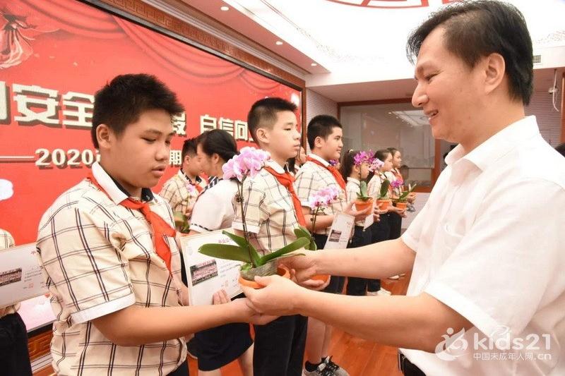 毕业典礼最后一个环节,学校领导为毕业生颁发毕业证书,为每位毕业生赠送校花——兰花,希望同学们不管身在何方,都秉承兰花清雅、高洁、傲骨的精神品格,努力践行社会主义核心价值观,奋力拼搏,将来做个对社会有用的人。(南宁市秀厢小学 李凡贵 莫秀妮)