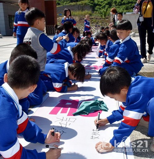 孩子们在“我是小学生啦”横幅上签上自己的名字
