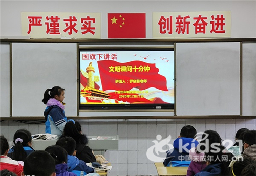 举行一次国旗下讲话。12月21日,宣讲员从学生实际出发,通过宣讲“文明课间十分钟”引导学生认识课间存在的安全隐患及课间文明活动行为的重要性,呼吁学生养成良好的课间活动习惯,学会过一个安全、文明、愉快的课间活动。