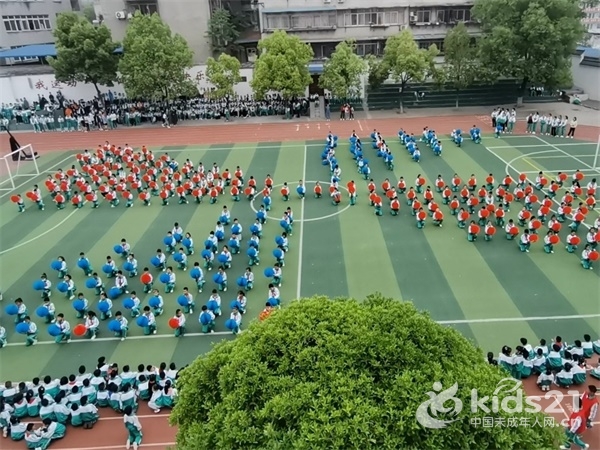 随着音乐响起,手持彩球的300人矩形方阵霎时铺满运动场。整个表演共有方阵队形变换、“风轮”图案和“工匠”“加油”字样四次大的变换。配合着音乐,队形有方阵变为图案,有图案变成字样,红、黄、蓝、绿四个颜色或单独或交替显现,现场甚为壮观。当寓意新时代的“工匠”们在新的征程上像“风轮”一样“加油”向前,喜迎二十大的图案或字样出现时,更是让在场人员不由得发出惊呼与赞叹。表演中,整个方阵动作整齐划一,队形变化多姿,色彩艳丽,展现了肖小孩子们朝气蓬勃、健康向上的精神风貌。