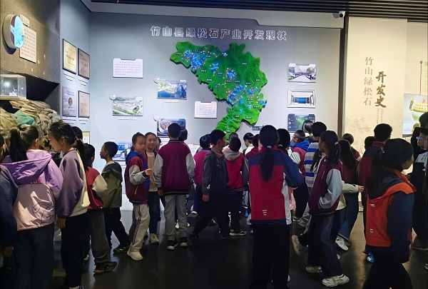 在矿产资源板块展区,面对陈列的绿松石、赤铁矿、钡盐、铌稀土矿等县内特有矿产标本,展教老师细致讲解了它们的分布、成因,重点介绍绿松石和铌稀土矿的特性、用途。学生们围在展柜旁,近距离观察矿石纹理、色泽,积极提问互动,进一步增强了珍惜资源、保护资源的社会责任感。