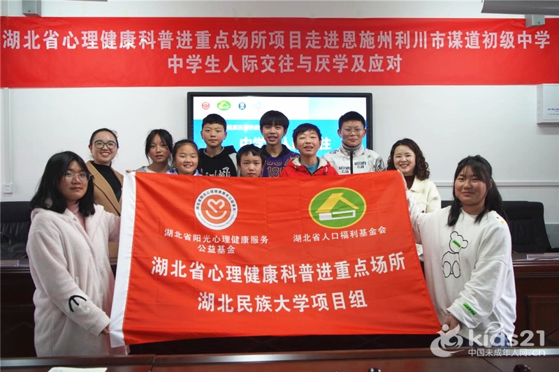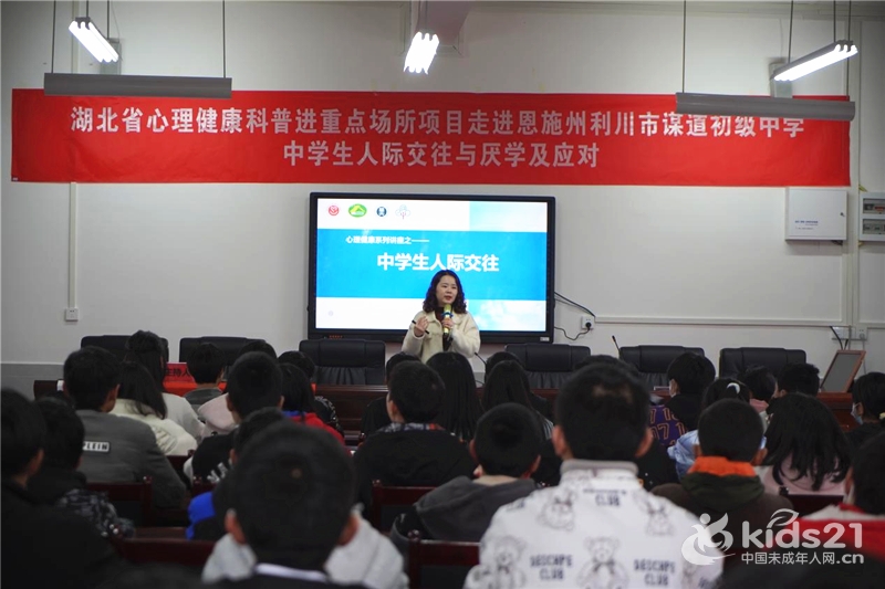 为了扎实推进恩施州中小学心理健康护航工程,进一步提升学生积极处理人际关系的能力,3月31日,湖北省心理健康科普进重点场所项目——湖北民族大学项目组走进利川市谋道镇初级中学。该校100余名学生聆听了主题为“中学生人际交往”的心理健康讲座。