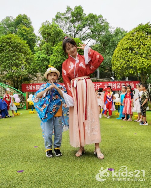 环保时装秀正式开场,老师们的集体走秀拉开帷幕,老师们穿着汉服缓缓走来,向孩子们展示了传统服饰的美丽;孩子们则穿着用废旧物品制作的环保时装走上舞台,有用塑料袋做成的裙子、有用纸做成的帽子、还有用纸箱做成的恐龙……
