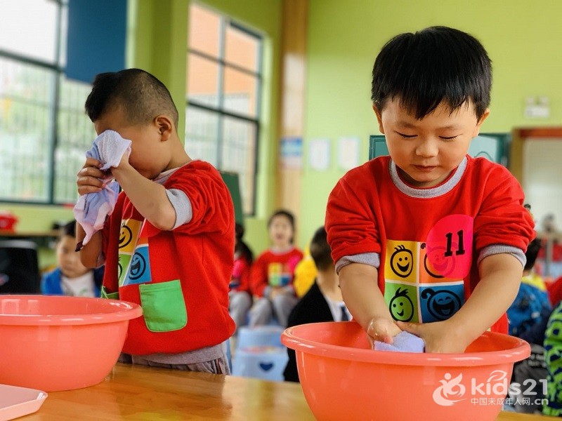 大班幼儿洗脸比赛进行中,看谁洗得又快又干净