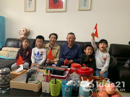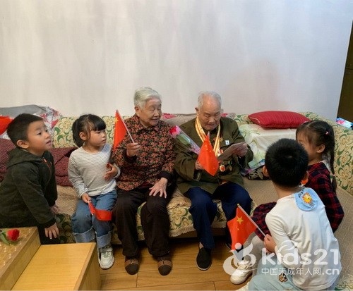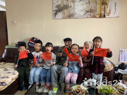 孩子们来到老红军爷爷的家中,为他们献上鲜花以及亲手绘制的国庆节贺卡。孩子们还和老红军爷爷共同合唱《歌唱祖国》,“五星红旗迎风飘扬,胜利歌声多么嘹亮……”孩子们用童稚的歌声向老红军表达着自己崇高的敬意。