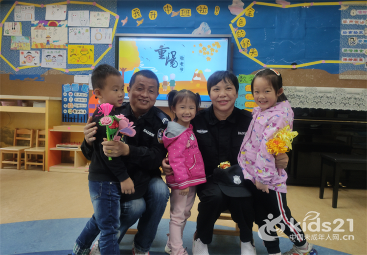 升旗仪式结束后,老师们便根据各年龄阶段特点,开展了有针对性的重阳节相关活动。中班教师扮演爷爷奶奶与幼儿一起开展“我是这样做的-敬老爱老”情景剧表演。“我以后每天要给爷爷奶奶按摩捶背!”夏铭小朋友高兴地说道。表演过后,老师将保安爷爷奶奶也请到了班级,孩子们为保安爷爷奶奶献上自己用环保材料制作的花,保安爷爷奶奶开心的笑容传递在教室中。“谢谢小朋友们送的礼物,这是我第一次过重阳节,我永远也不会忘记今天。”保安奶奶激动地说。