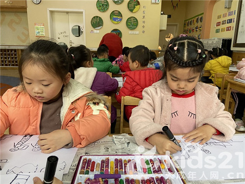 幼儿正在绘画心目中祖国最美的样子。