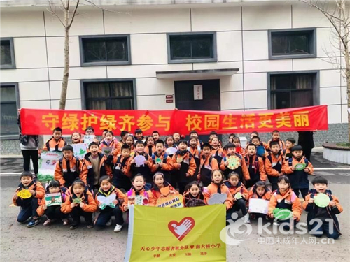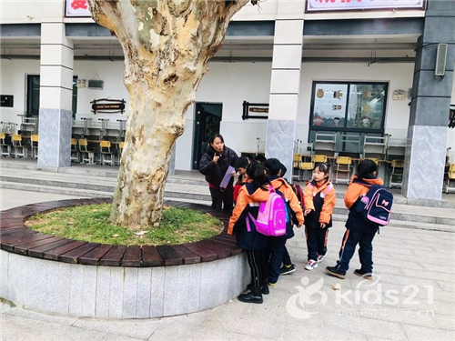 2021年1月21下午,长沙市南大桥小学一年级的同学们与家长志愿者们在老师的带领下开展了“为校园添上一笔绿色·爱绿护树”活动。