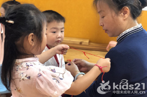 小朋友们为老师系彩绳