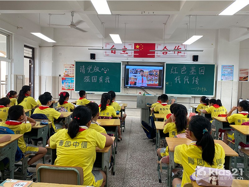最后,全体同学认真观看了由井冈山小骨干优秀学员表演的朗诵节目《红星》和“七一”建党一百周年庆祝大会上共青团员和少先队员献词的视频。视频中的少年意气风发、献词声音铿锵有力,引领着同学们见证着祖国的繁荣昌盛,激发着同学们的爱国之情,也将红色基因厚植学生心中。作为新时代的好少年,青园中信小学的莘莘学子将牢记嘱托,在全面发展中书写新时代华章。(长沙市天心区青园中信小学 谭任廷)