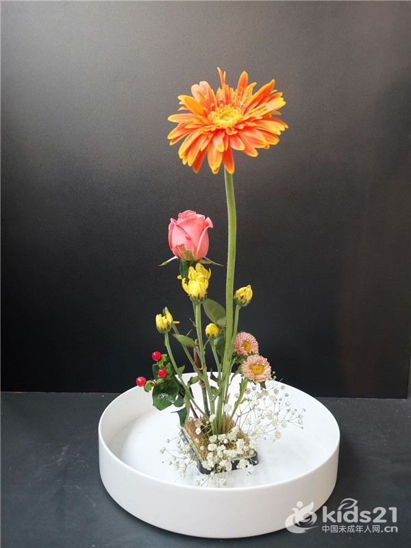 本次插花过程还融合了中秋节的相关元素,通过不同花材表达对中秋节的祝福。孩子们在老师的辅导下,运用向日葵、玫瑰、非洲菊、红豆等花材,巧妙构思,将自己的创意转化为一件件高低错落、疏密有致,兼具自然美和生活美的艺术品。