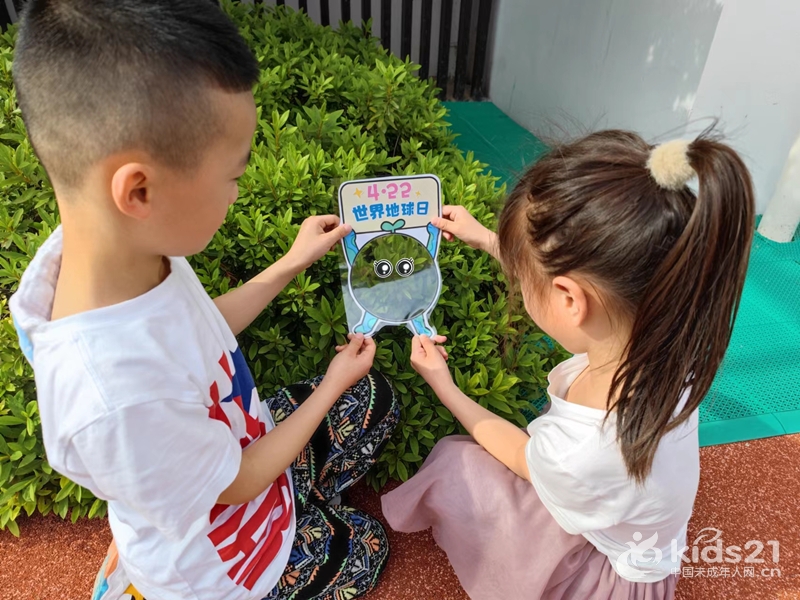 孩子们用自制相机拍摄下校园花圃里枝繁叶茂的景象,提示人们要爱护地球妈妈,把绿色常留人间。
