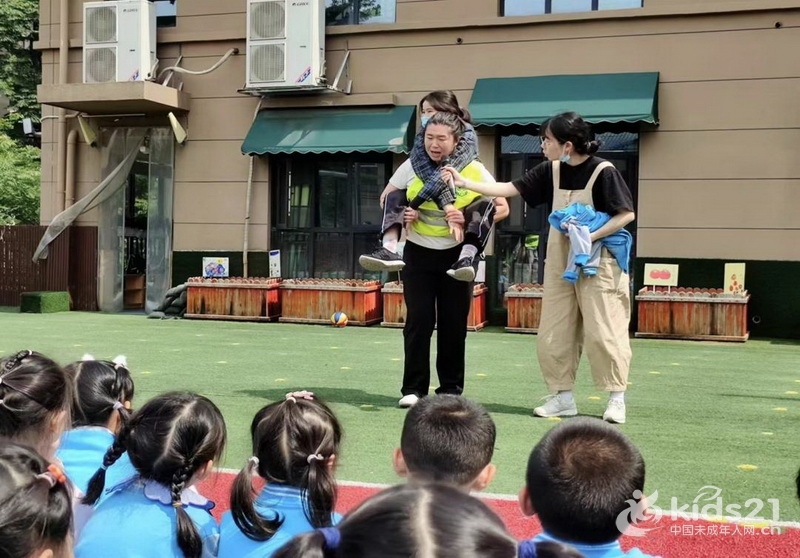 王老师给幼儿示范正确救援伤员的方法