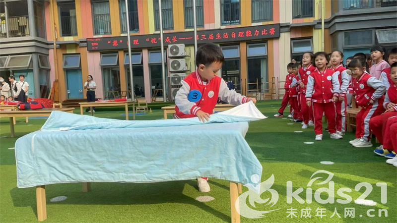随着主持人的一声令下,大班组幼儿率先出赛,展示叠衣服、用筷子夹花生、整理书包、叠被子等项目,孩子们动作娴熟,进行速度与技艺的追逐,观众席的幼儿攥着拳头为伙伴们加油呐喊,现场欢呼声一片。