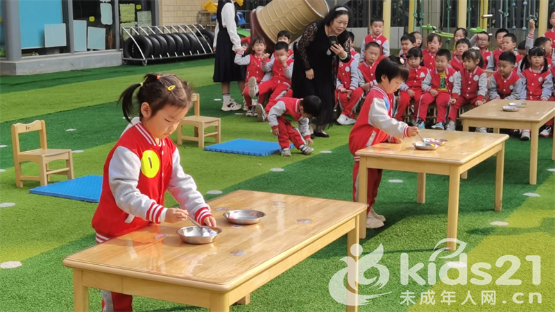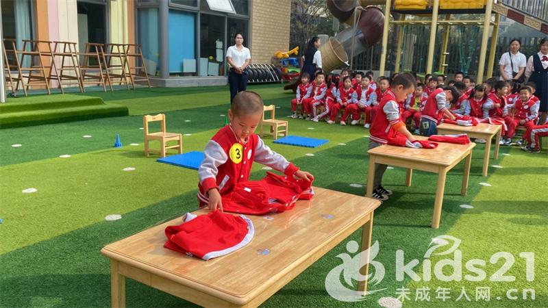 中班的幼儿也不遑多让,依次进行穿鞋子、叠衣服、剥橘子、洗手、叠毛巾的比赛,选手们认真专注,将平时在生活中所学的本领充分地展现出来。“内、外、夹、弓、大、立、腕”,孩子们一边念着七步洗手法的口号,一边熟练地清洗双手,率先完成的幼儿兴奋地挥舞着红旗。