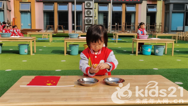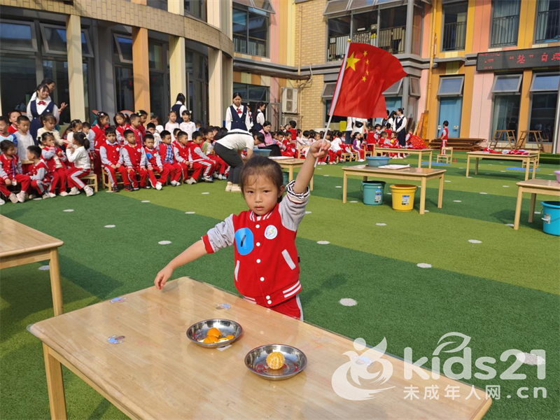 随着小班组幼儿的入场,比赛现场瞬间充满童趣和欢乐,刚入园两个月的幼儿在赛场上动作虽然稚嫩,但勇于尝试,认真专注地剥起橘子。完成项目举起小红旗时,满是开心的笑容,孩子的童真瞬间感染着所有人。