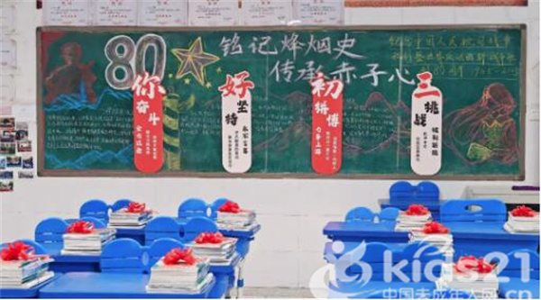 六年级以“逐梦前行,不负韶华〞为主题,外墙书香满盈,孩子们的各类阅读作品让人惊叹不已;后黑板则充满怀旧与感动,铭记抗战历史,珍惜幸福生活是每个孩子心中的信念;前板醒目的大字更是鼓舞孩子们迈进新学期的新征程,一定要严于律己、宽以待人、不断奋进。