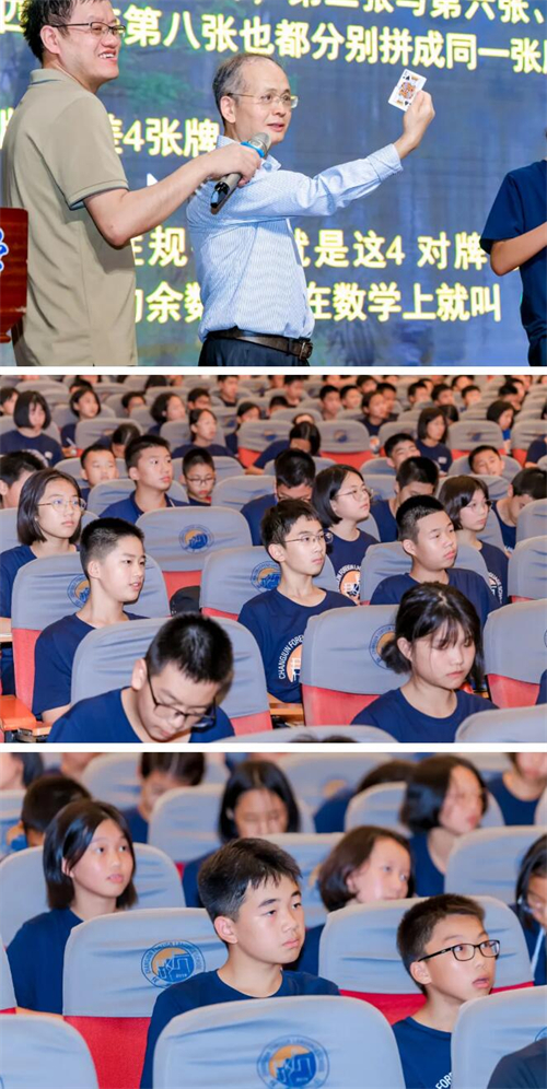 在几何领域,周院士聚焦《周髀算经》中商高与周公的对话,阐释“勾股定理”的证明与“折矩”“积矩”思想,强调其开创了命题证明的先河。他进一步以“魔术中的数学”为例,通过扑克牌游戏揭示同余定理(如模4同余)的规律,并关联至“物不知数”问题与“中国剩余定理”,彰显中国古代数学在解决不定方程中的卓越智慧。