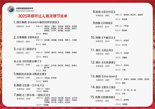 为丰富校园文化生活,搭建学生才艺展示平台,激发学生青春活力与艺术创造力,2025年12月17日下午,我校第七届“郡外达人赛”决赛在学校卓越厅盛大举行。天心区总辅导员吴海芸,学校党委书记周文美,执行校长毛艳辉,副校长孙亚飞、李迎嘉、胡文叶、齐帅莅临活动现场,与全体评委老师、师生代表共同见证这场精彩纷呈的才艺盛宴。