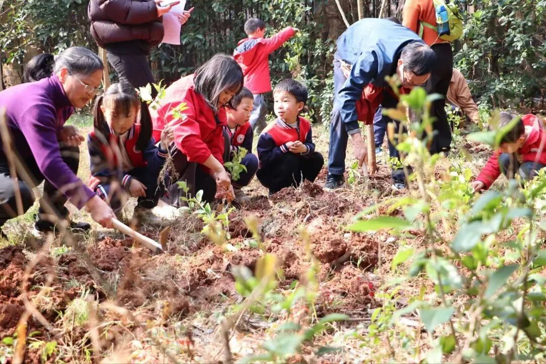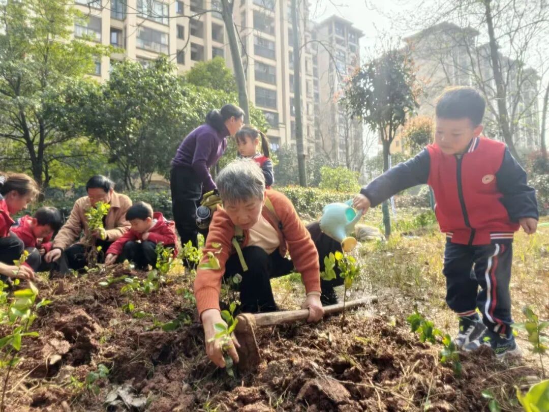 此外,幼儿园还开启家校社联动的“一公里课程”。孩子、家长、老师一起走进大自然, 共同栽下树苗,在劳动中体会植树护绿的价值,让绿色理念深深融入心田。