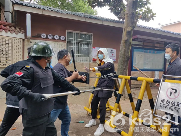 此次演练以警情模拟的形式展开,本校葛家均老师模拟了“歹徒”冲进校园袭击的场景,“歹徒”手持凶器,欲闯入校园,保安及时联系校园保卫处立即拉响一键报警系统,学校立即启动校园防恐防暴安全预案。
