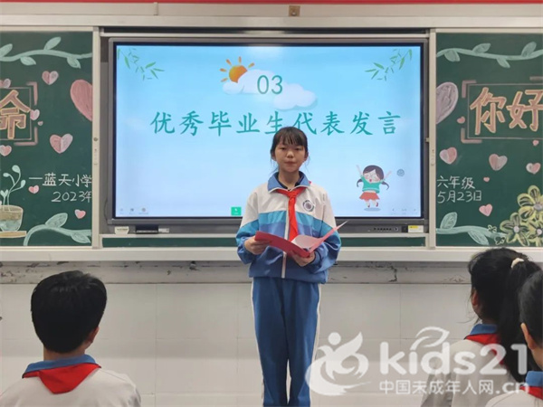 付老师还寄语毕业生们:“千里之行,始于足下,我们是祖国的未来,是民族的希望。现在我们可以努力做一名优秀的少先队员,今后,我们还可以成为优秀的共青团员,优秀的共产党员。祖国的灿烂明天在于我们今天的努力,让我们从现在做起,队旗飘飘跟党走,用汗水浇灌理想的花园。命运靠自己主宰,人生由自己把握。祝愿各位同学经过不懈努力,前途无限,未来可期!”