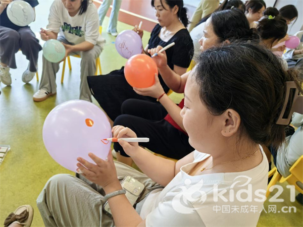 进入“情绪气球”环节,教师们拿起笔,将“疲惫”“焦虑”“烦躁”等看不见的负面情绪,一一写在彩色气球上,抽象的情绪瞬间变得具体可触。随后的“放飞心情”环节,以“传送拍打”形式展开。教师们围圈站立,将写满情绪的气球轻轻传递,每拍一次,就像把一份压力“转交”出去,在互动中逐步放下心理负担,现场满是轻松的笑声。教师们真情流露,全身心地投入到活动中,用行动缓解焦虑,回归当下。