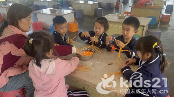 午餐后,劳动实践活动成为主角:独轮车运粮游戏中,孩子们变身“小小运输员”,亲手操作传统运输工具,在实践中了解劳动方式的演变,更在小组配合中学会了分工协作。“玉”见童年自然手作环节,大家用扭扭棒、串珠DIY玉米棒,同时了解了玉米的种植知识与营养价值,在动手创作中感知秋收的喜悦,建立对自然与食物的认知。