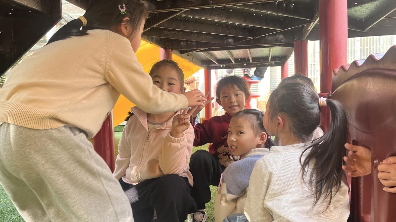 滑滑梯旁,孩子们开心地分享着寒假里的趣事