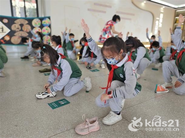 给鞋子系上鞋带要多少时间?二、三年级同学的考核项目是系鞋带。“开始!”主持人一声令下,同学们立即动起手来。不到10秒钟,最快的同学就系好了鞋带。根据要求,两分钟内系好一根鞋带就算合格。经过家长评委的检查,参加考核的同学全部合格,很多同学获得了“优秀”等第。