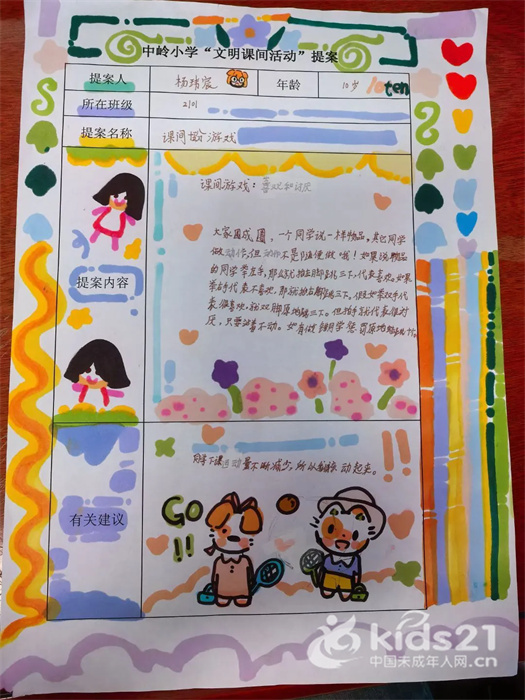 一、二年级的孩子们通过模拟家庭待客、遵守餐桌礼仪等场景,学会使用“请”“谢谢”等礼貌用语,塑造良好的礼仪习惯。三、四年级的孩子们则拿起画笔,创作校园文明宣传画,定格同学们有序排队等美好瞬间。五、六年级的孩子们则对课间十分钟进行调研,分析安全文明的玩法,并设计提案,用思考助力校园的有序发展。