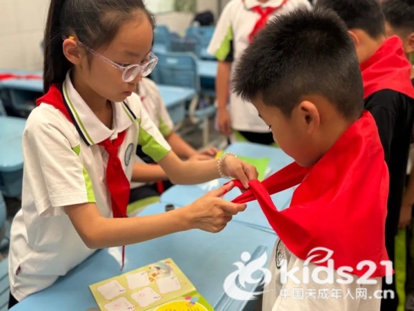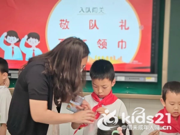 在“系红领巾”环节,预备队员们手法娴熟,将鲜艳的红领巾在胸前系得整齐美观,在实际操作中体验了少先队员的责任与担当。