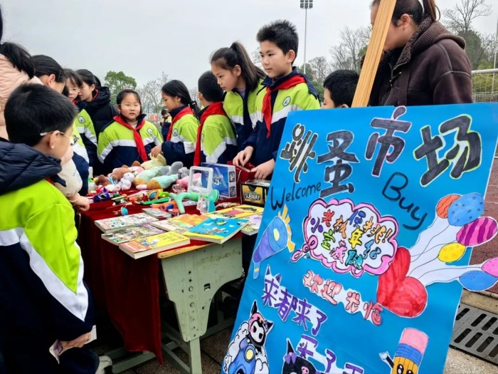 “走过路过不要错过!”“How much is this?”“It’s five yuan.”3月4日,长沙市天心区梨塘小学的校园里吆喝声此起彼伏,热闹非凡。正值开学报到日,学校第七届跳蚤市场爱心义卖活动火热开市,三至六年级学生尝试用英语进行买卖交流,全体师生与部分家长志愿者共同参与,在闲置物品的流转中开启新学期的第一堂“德育课”。