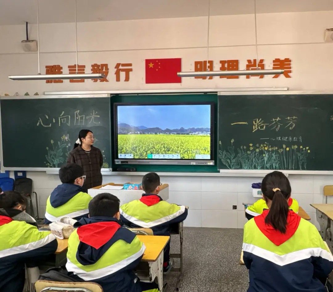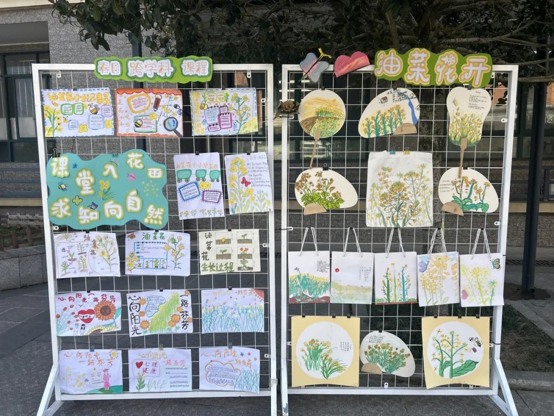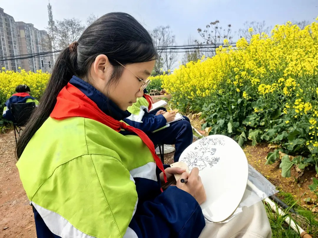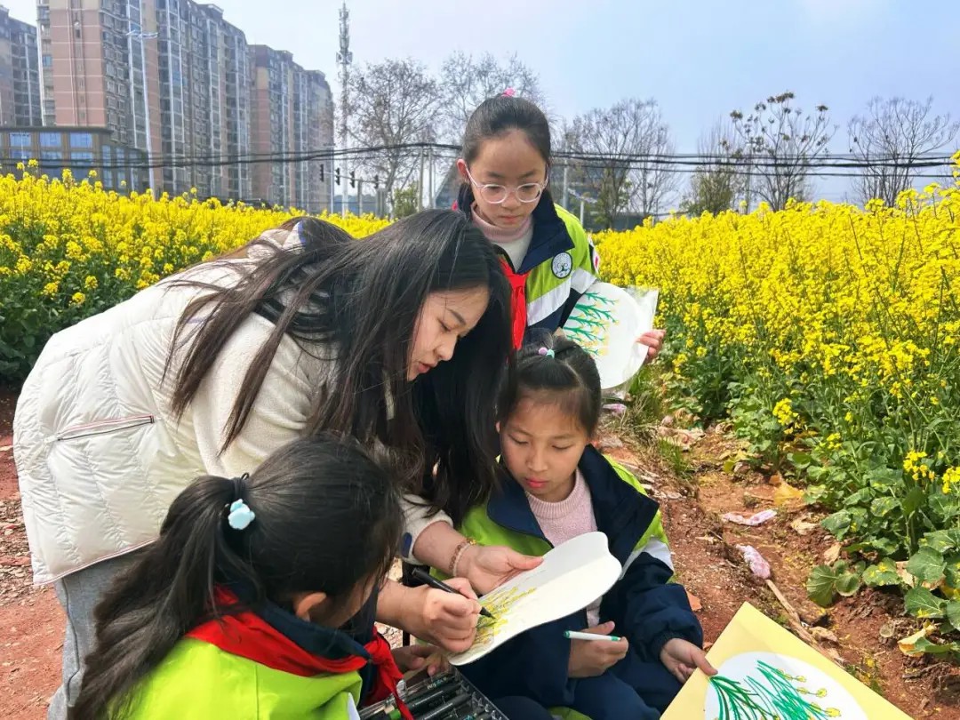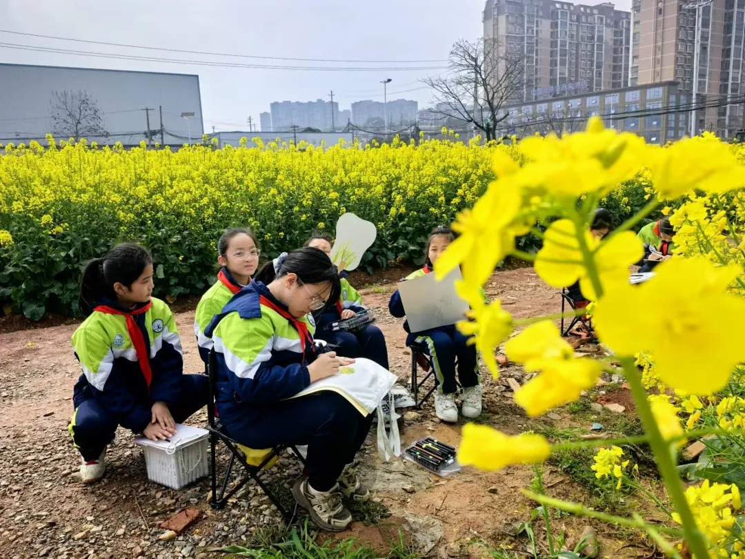 学校摒弃了枯燥的书本理论,以校园毗邻的油菜花田为载体,将语文、科学、艺术、劳动等学科要素有机融合,构建了一堂沉浸式的“田野大课堂”。在花田之中,油菜茎叶成为了科学课探究植物生长的鲜活样本,花海光影化作了美术课捕捉色彩的天然画板,春日景致更成了语文课抒发情怀的灵感源泉。此外还开展“向阳生长,一路芬芳”心理团辅,在大自然的拥抱中疗愈身心,涵养积极心态;跨学科不再是教案上的名词,而是师生们在花田间用画笔、镜头和文字共同书写的动词,让学习真正活了起来。
