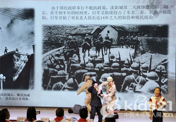 首先是情景剧表演,1902中队的小演员们以精湛的演技,生动演绎了日本关东军精心策划炸毁南满铁路并嫁祸于中国军队的阴谋,以及东北全境沦陷后,日军对东北人民长达14年之久的奴役和殖民统治。