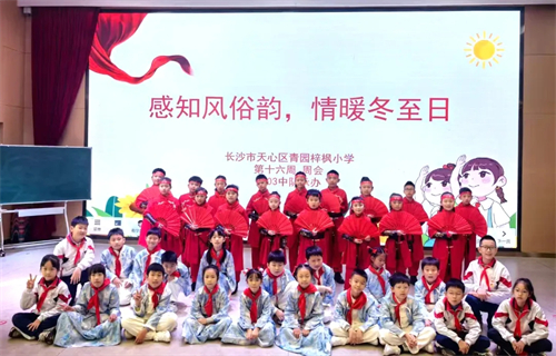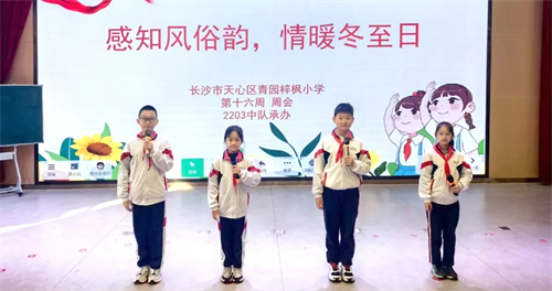 为传承中华优秀传统文化,培育少先队员文化自信与家国情怀,12月15日,青园梓枫小学开展以“感知风俗,情暖冬至”为主题的少先队活动暨“青枫队校”第七十期思政课,活动由2203葵花籽中队策划承办。