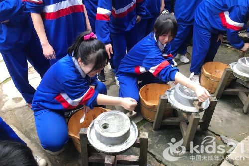 在秦谷,师生们观看酿酒,了解酿酒工艺流程;体验打糍粑、熬糖、磨豆腐、榨油;体验刺绣、织布、陶艺、铜铸;了解木雕、竹编工艺流程。各式各样的体验项目,目不暇接。在专业老师的指导下,同学们纷纷体验一番,趣味十足。