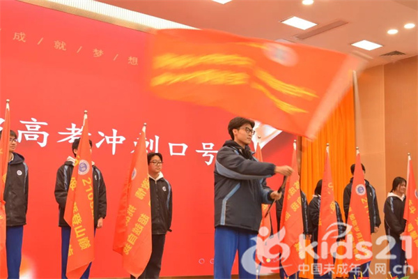 学生代表们依次接过象征着希望和胜利的火红的大旗,挥舞着、昂扬地指向各班级方阵。接着,全场高三学子以班级为序,高声吼出了高考冲刺的口号,一阵又一阵震耳欲聋的宣誓声,喊出了决心,激发了斗志。