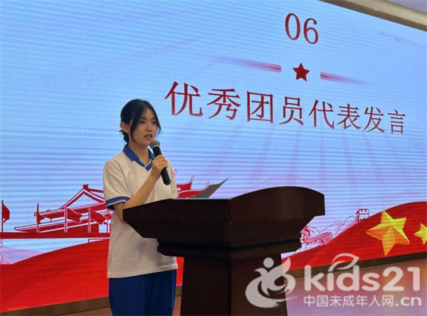 优秀团员代表杨知谦同学也分享了她的成长感悟。她结合自身入团一年多来的经历,勉励新团员们要倍加珍惜这份来之不易的荣誉,时刻牢记入团誓词,将团员身份视为鞭策自己不断前进的动力,同时号召大家主动融入集体,在服务奉献中磨砺意志品质,在担当作为中实现个人价值,共同为集体的进步和学校的发展贡献青春智慧与力量。