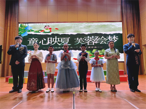 八位学生主持人以诗意的开场合诵点燃现场:“五月的风穿过粽叶的清香,六月的光点亮童年的星光”,宣告芙蓉大地上的童心梦想正式起航。