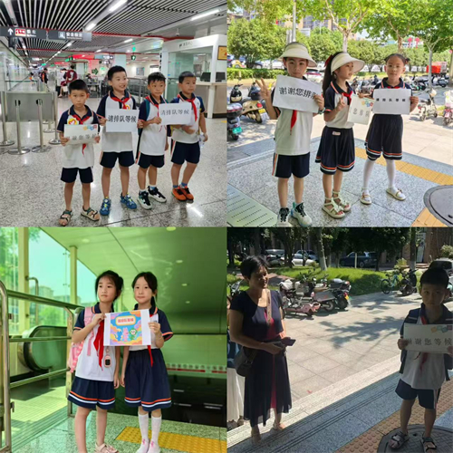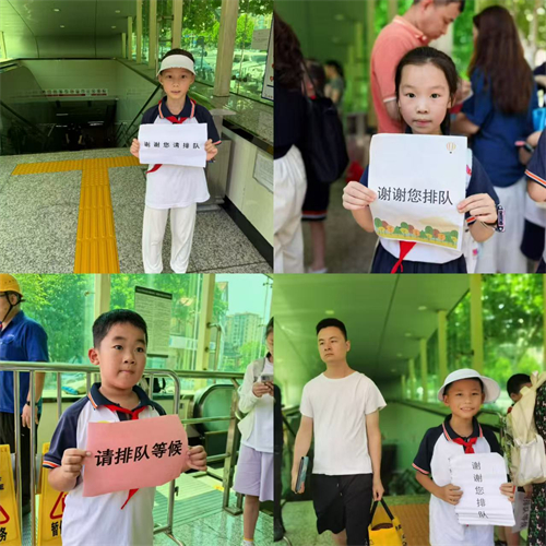 活动刚开始,队员们通过互动问答学习了排队礼让的重要性,并现场演示了文明乘梯、有序通行的正确做法。在家长志愿者的陪同下,队员们用手持自制的标语牌,用稚嫩而真诚的声音提醒乘客"请排队等候",为地铁站增添了一道文明风景线。