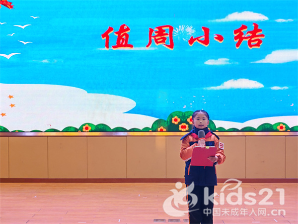 节目结束后,大队委郭垚柳同学登台进行值周小结,细数校园点滴进步,提出温馨成长建议,每一句叮嘱都饱含对校园的爱护。