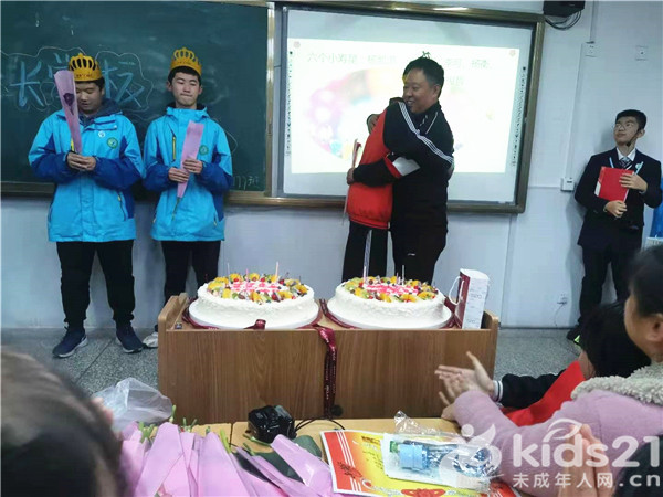 最后,在生日祝福环节,班里6位小寿星的父母们亲自为孩子戴上了漂亮的生日帽,与学生们一起唱起了生日快乐歌,给小寿星们送上了最美的祝福。在动人的音乐感染下,在浓浓的祝福氛围中,小寿星们也情不自禁地为自己的父母献上了鲜花,并饱含热泪,紧紧地与父母拥抱一起,激动地说:“我们的生日就是你们的受难日,你们辛苦了……”。听到孩子们的真情表白,家长们的眼泪也瞬间夺眶而出。班里所有的学生在小寿星们的影响下,都对父母表白并送上鲜花,进行深情的拥抱,把主题班会推行了高潮。