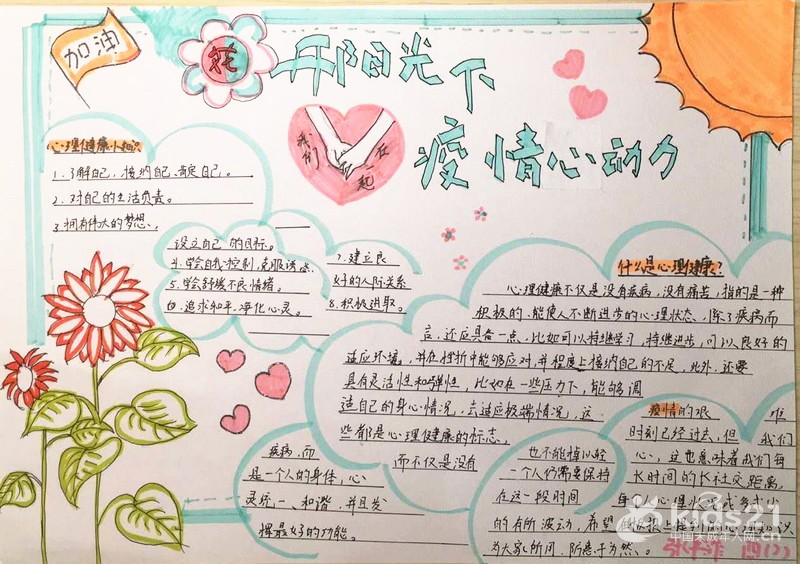 学校还将防疫和心理健康相结合,鼓励学生将表达自己所见所闻所感所想,并用手抄报的形式呈现出来,学校还开设了专栏展示各班优秀手抄报。