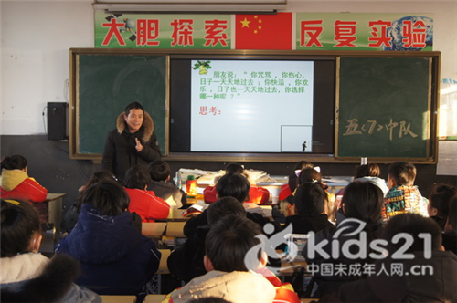班会课上,班主任老师针对小学生普遍存在的“承受挫折的能力较弱”“对身边的生活不珍惜”“产生矛盾时对己不克制”等共性心理现象进行分析与矫正。班会活动中,老师教育学生要珍视生命,珍爱生活;正确认识自己、相信自己;克服焦虑心理、调整心态;面对压力、缓解压力、化解压力。