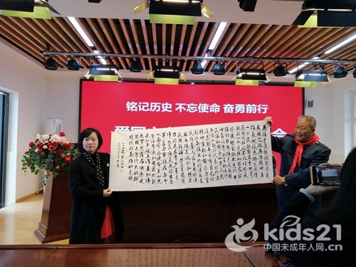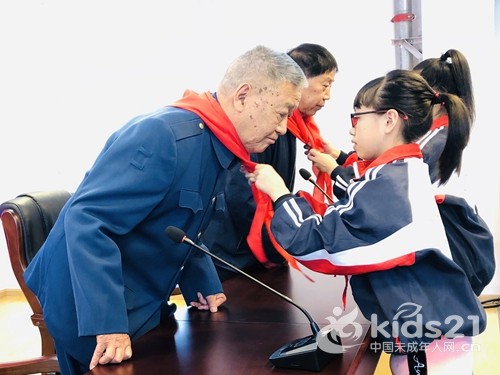 活动伊始,少先队员为关工委副主任袁海马、抗美援朝老兵贾汝功送上红领巾与鲜花,表达崇高的敬意。